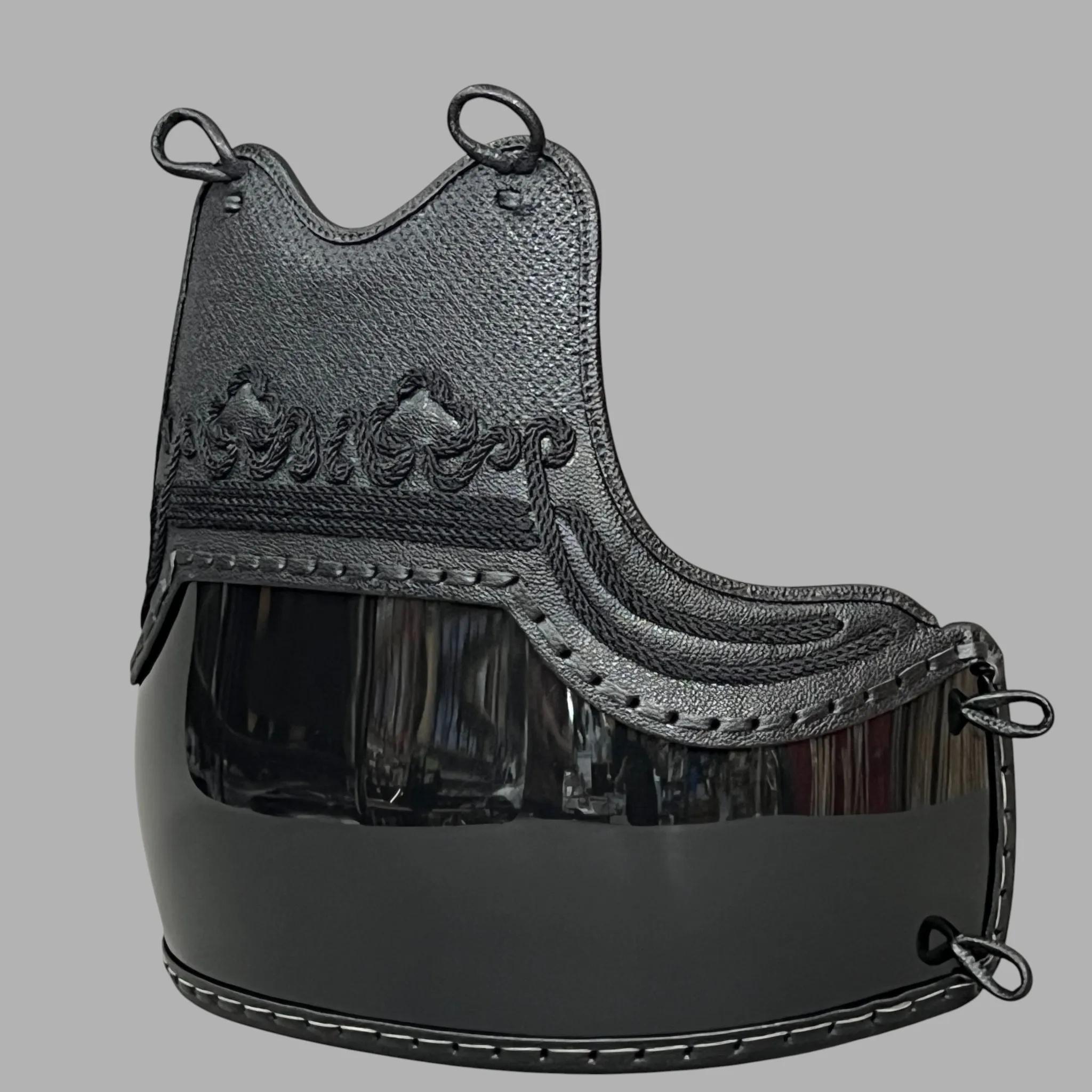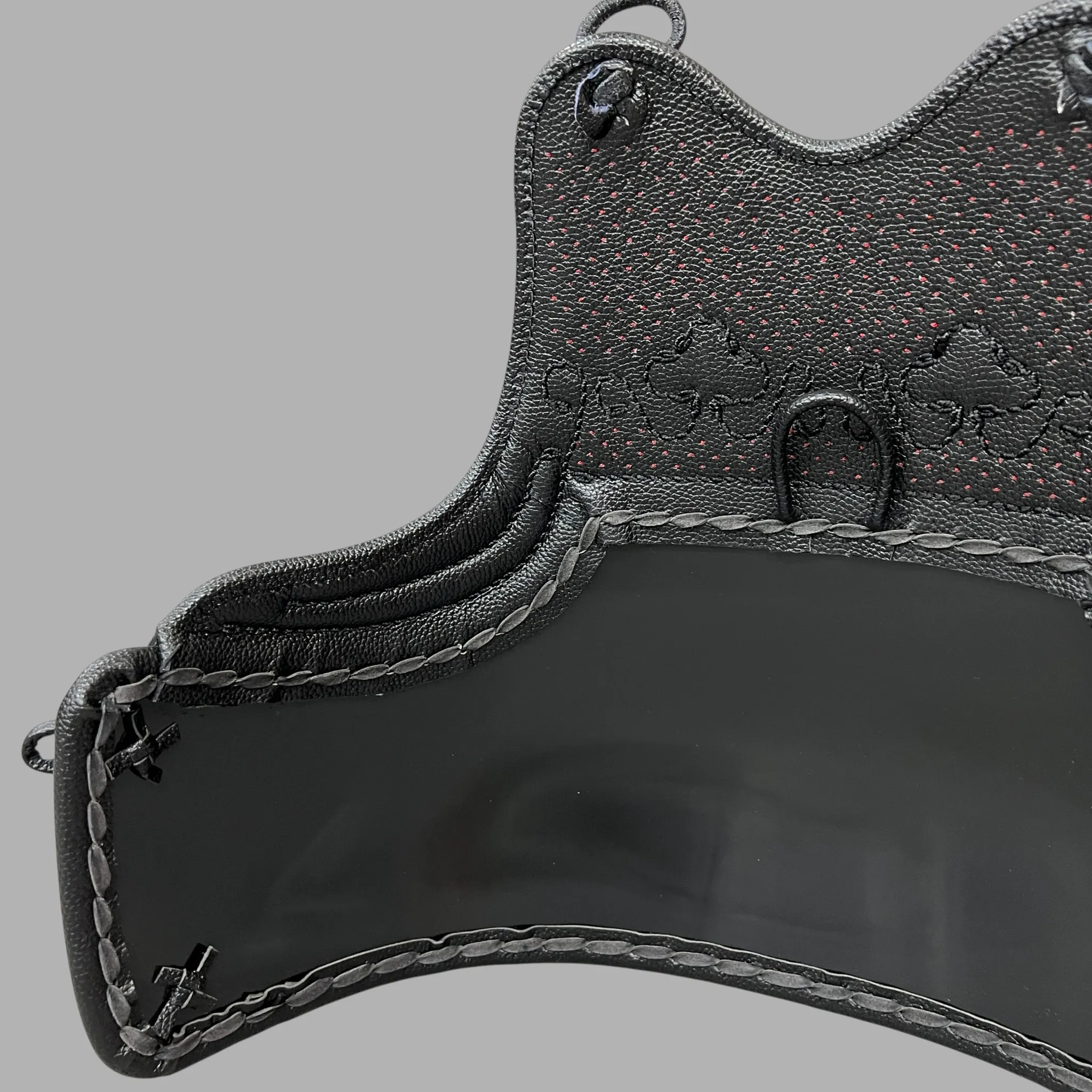 The Do is a standard black model made from strong resin for superior impact resistance. The Do-mune (upper chest piece) features a handwoven “”Oni-kumo”” (demon cloud) design—a bold and iconic motif often seen in high-grade bogu. While high-end Do may be made from lacquered bamboo, over 90% of modern Do are now made with resilient resin.