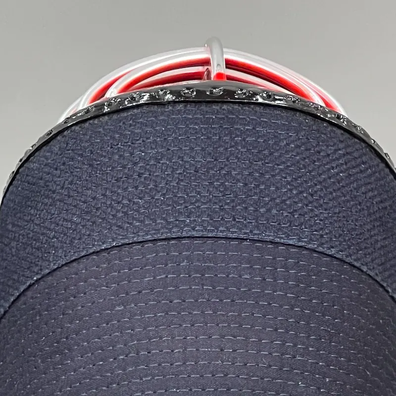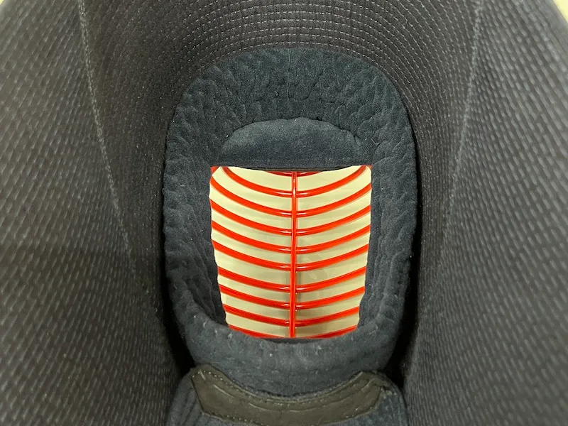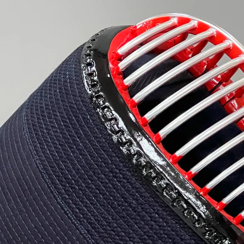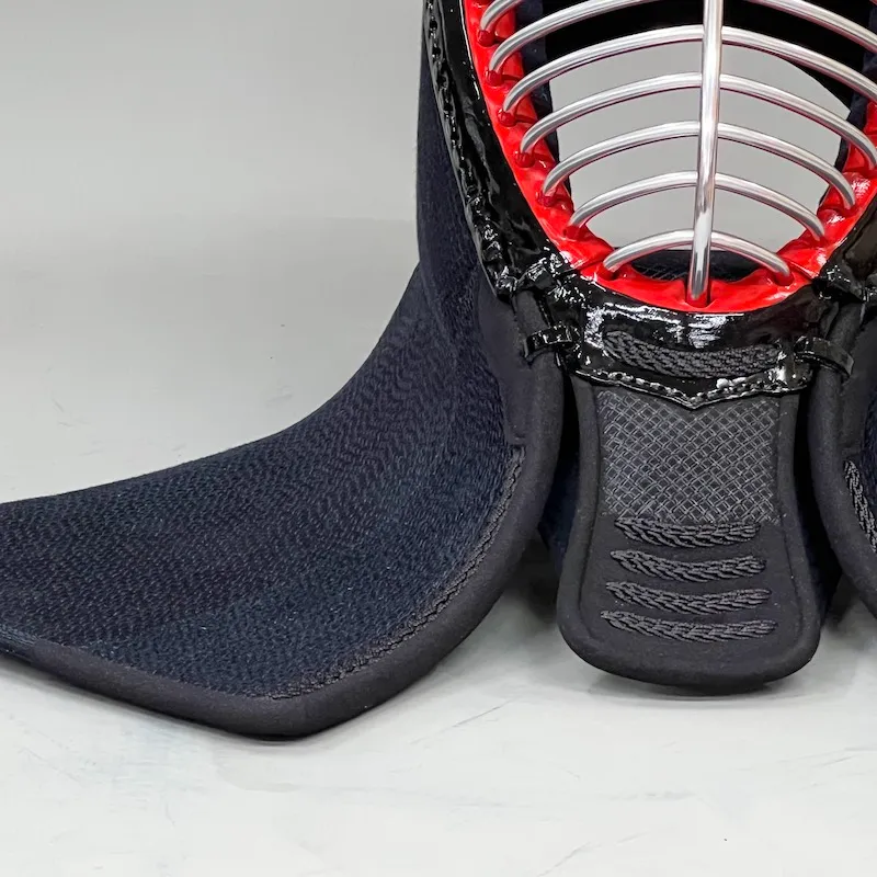 The noten (top center of the head) is stitched in straight 6mm lines, while the men-dare is stitched at 3mm width. This technique is called “Guno-me Zashi”, where different stitch widths are used for different sections. For example, a 6mm stitch on the top and a 3mm on the flaps helps maintain structure and improves shock absorption in key areas like the head and shoulders.